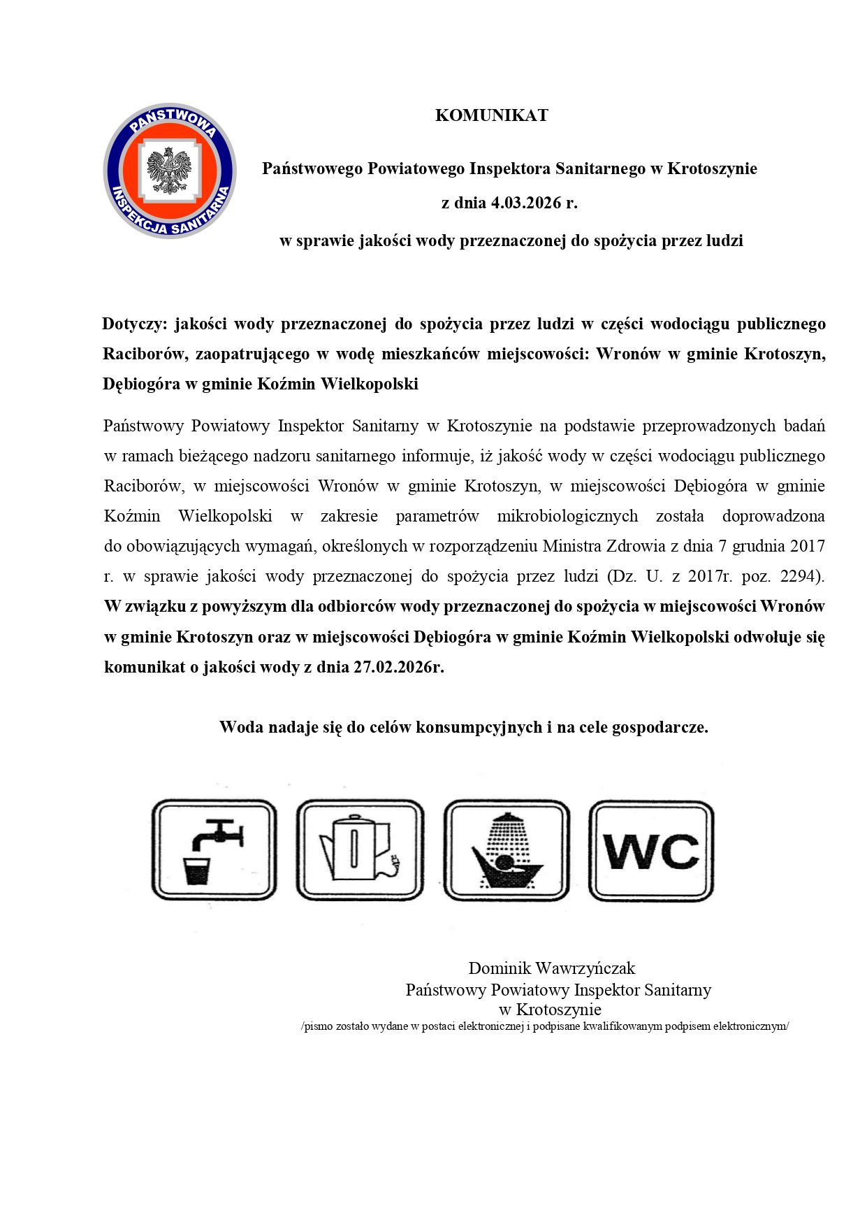 KOMUNIKAT– WRONÓW i DĘBIOGÓRA 04.03.2026 r. woda nadaje się do spożycia oraz do celów gospodarczych.